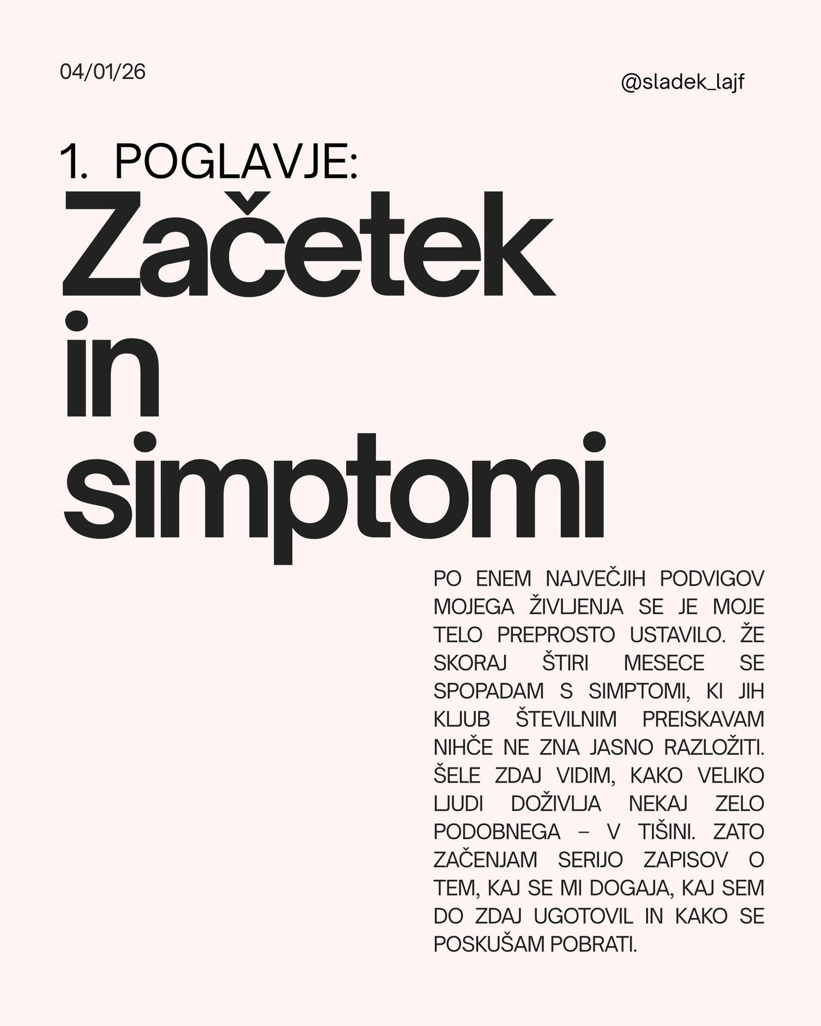 Ko sem 31. 12. 2025 objavil zapis o svoji situaciji, sem bil iskreno presenečen nad odzivom ljudi. Dobil sem ogromno sporočil, idej, predlogov, kaj bi lahko bilo narobe z mano in kaj vse naj poskusim, da si pomagam. Predvsem pa sem spoznal nekaj zelo pomembnega: izjemno veliko ljudi se spopada – ali se je že spopadalo – z zelo podobnimi simptomi, kot jih imam sam.